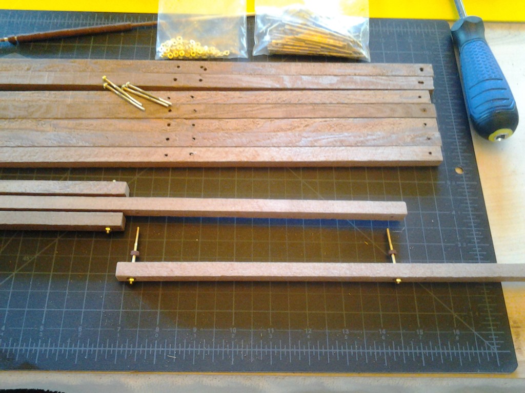 First step is to clean up all the flash on the metal casting and sand the wood parts. I then drilled with a # 56 drill and placed all the brass NB’s. The longitudinal beams need to have 1/8" cut from each end. The beams are a bit too long for the couplers to fit into the coupler pockets.